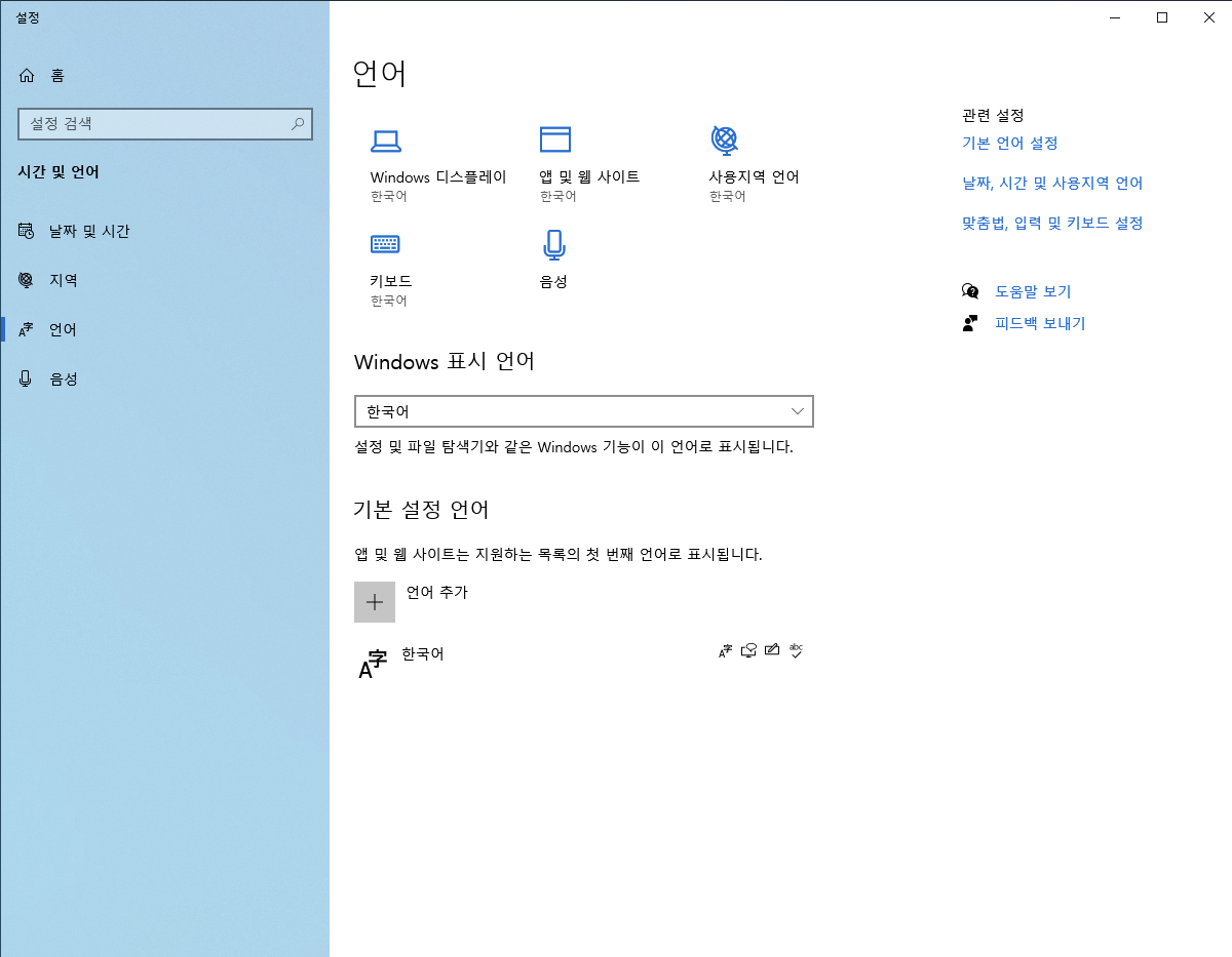 언어 - 기본 설정 언어 > 영어(미국) 삭제
